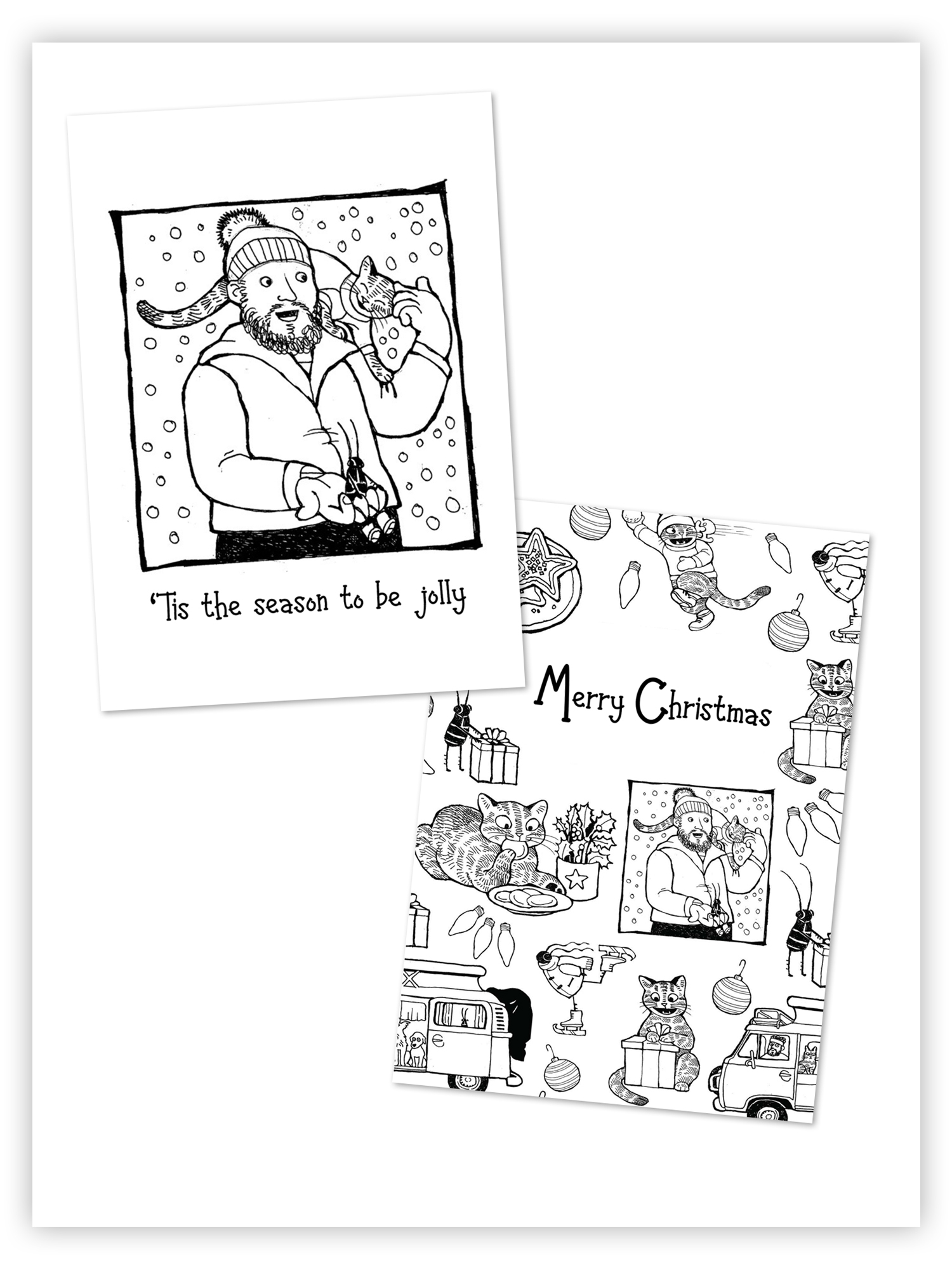 Spread a little holiday cheer with Kelly’s fabulous drawings of Dean, Nala, and Vinny! They will bring a smile to anyone’s face. Made on matte paper each item has been designed so you can colour in the illustrations yourself!