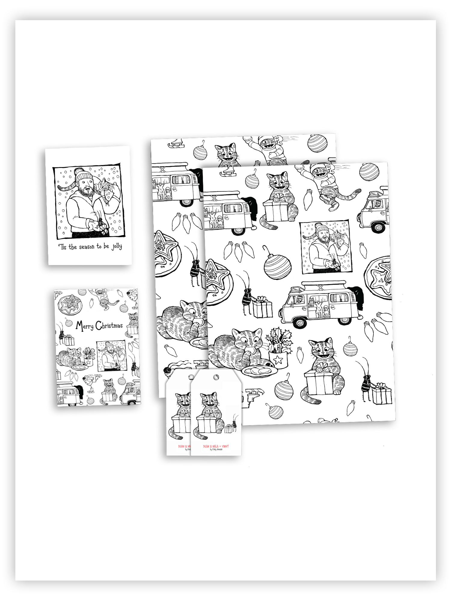 Get ready to sleigh the gift-giving game this Christmas with our Dean & Nala + Vinny wrapping paper complete bundle! Kelly’s fabulous drawings of Dean, Nala, and Vinny will bring a smile to anyone’s face. Made on matte paper each item has been designed so you can colour in the illustrations yourself!